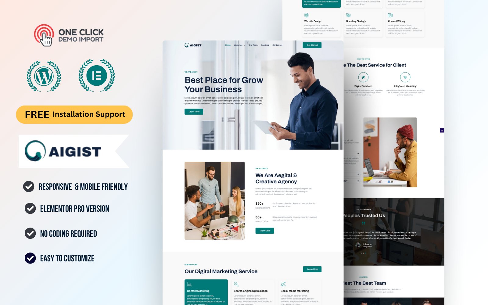 Aigist is a premium WordPress Elementor Template Kit designed specifically for Digital Marketing Agencies, SEO Firms, Social Media Managers, Creative Studios, and Tech-Savvy Consultants.